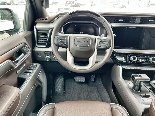 This vehicle features Preferred Equipment Group 5SA (120-Volt Bed Mounted Power Outlet, 120-Volt Interior Power Outlet, 170 Amp Alternator, 2 Charge/Data USB Ports Inside Center Console, 2 Type-C Charge-Only Rear USB Ports, 2 USB Ports, Auto-Locking Rear Differential, Auxiliary External Transmission Oil Cooler, Bed View Camera, Chrome Header with Signature Denali Chrome Grille, Chrome Recovery Hooks, Chrome Wheel to Wheel Assist Steps, Color-Keyed Carpeting Floor Covering, Deep-Tinted Glass, Denali Premium Suspension with Adaptive Ride Control, Electric Rear-Window Defogger, Floor-Mounted Center Console, Front Rain-Sensing Wipers, HD Surround Vision, Heated 2nd Row Outboard Seats, Heated Driver and Front Outboard Passenger Seating, Heavy-Duty Air Filter, Hill Descent Control, Hitch View, in-Vehicle Trailering System App, Integrated Trailer Brake Controller, Keyless Open and Start, LED Cargo Area Lighting, OnStar Services Capable, Perimeter Lighting, Power Door Locks, Power Front Passenger Windows with Express Up/Down, Power Front Windows with Driver Express Up/Down, Power Rake and Telescoping Steering Column, Power Rear Windows with Express Down, Power Sliding Rear Window with Rear Defogger, Premium Bose 7-Speaker Sound System, Push Button Start, Rear Cross Traffic Braking, Rear Pedestrian Detection, Rear Wheelhouse Liners, Remote Vehicle Starter System, SiriusXM with 360L Trial Subscription, Spray-on Pickup Bedliner with GMC Logo, Steering Wheel Audio Controls, Theft Deterrent System (unauthorized Entry), Trailer Camera Provisions, Trailer Side Blind Zone Alert, Ultrasonic Front and Rear Park Assist, Universal Home Remote, Ventilated Driver and Front Passenger Seats, Wheels: 20 x 9 Multi-Dimensional Polished Aluminum, Wi-Fi Hotspot Capable, and Wireless Charging), Technology Package (Multicolor 15 Diagonal Head-Up Display and Rear Camera Mirror), Trailering Package (Hitch Guidance), 10-Speed Automatic, 4WD, Atmosphere/Brownstone Leather, 12-Way Power Driver Seat Adjuster with Lumbar, 12-Way Power Passenger Seat Adjuster with Lumbar, 3.23 Rear Axle Ratio, 4-Wheel Disc Brakes, 7 Speakers, ABS brakes, Adaptive suspension, Air Conditioning, Alloy wheels, AM/FM radio: SiriusXM with 360L, Apple CarPlay/Android Auto, Auto High-beam Headlights, Auto-dimming door mirrors, Auto-dimming Rear-View mirror, Automatic temperature control, Brake assist, Buckle to Drive, Bumpers: body-color, Compass, Delay-off headlights, Driver door bin, Driver Memory, Driver vanity mirror, Dual Active Exhaust, Dual front impact airbags, Dual front side impact airbags, Electronic Stability Control, Emergency communication system: OnStar, Enhanced Automatic Emergency Braking, Following Distance Indicator, Forge Perforated Leather Seat Trim, Forward Collision Alert, Front anti-roll bar, Front Bucket Seats, Front Center Armrest, Front dual zone A/C, Front fog lights, Front License Plate Kit, Front Pedestrian Braking, Front reading lights, Front wheel independent suspension, Fully automatic headlights, Garage door transmitter, Genuine wood console insert, Genuine wood dashboard insert, Genuine wood door panel insert, GMC MultiPro Power Steps, GMC MultiPro Tailgate Step Lights, Heated door mirrors, Heated front seats, Heated rear seats, Heated steering wheel, Illuminated entry, IntelliBeam Automatic High Beam on/Off, Lane Keep Assist with Lane Departure Warning, Low tire pressure warning, Memory seat, Navigation System, Occupant sensing airbag, Outside temperature display, Overhead airbag, Overhead console, Panic alarm, Passenger door bin, Passenger vanity mirror, Power door mirrors, Power driver seat, Power passenger seat, Power steering, Power Sunroof, Power windows, Radio data system, Radio: Premium GMC Infotainment Audio System, Rain sensing wipers, Rear readin